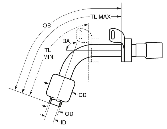 ID: diámetro interior (lumen) en el extremo inferior de la cánula AD: diámetro externo de la cánula A: Longitud C: Longitud B: Longitud TL: Longitud sobre el arco central AB: Longitud sobre el arco externo BW: ángulo de giro CD: diámetro del balón